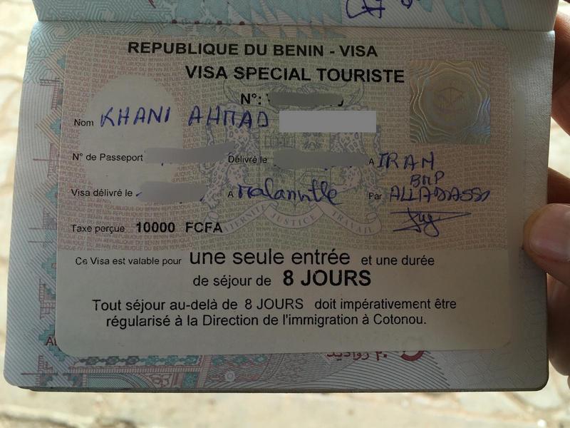 بعد از گپ زدن با والری و خوردن ناهار، آقای پلیس برگشت و پاسپورت ها را بهم داد. هرچی پاسپورت رو ورق زدم اثری از ویزا ندیدم ولی یک مهر ورود به بنین توی پاسپورت خورده بود. بهش گفتم حل شد؟ گفت مشکلی نیست 😊 ظاهرا پولی هم برای مهر کردن پاسپورت نداده بود. مطمئن بودم برای بنین نیاز به ویزا داریم و نگران لحظه خروج بودم.