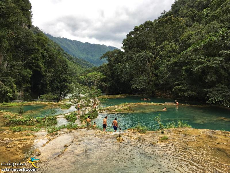 بعد از ناهار قسمت اصلی تور که پارک ملی لانکین یا همون سموک چمپی بود. چندین حوضچه یا برکه که در اثر ساختار آهکی زمین ایجاد شده. ورودی پارک ۵۰ کتزال بود که توسط راهنما پرداخت شد. یک مسیر نیم ساعته رو از بین جنگل بالا رفتیم تا به نقطه ای برسیم که کل برکه ها و منطقه رو میشد دید. خیلی من رو یاد پارک ملی پلیتویچکا در کرواسی انداخت البته با مقیاس کوچکتر. از یک مسیر دیگه پایین اومدیم و وقت آزاد داشتیم برای شنا کردن توی برکه ها.