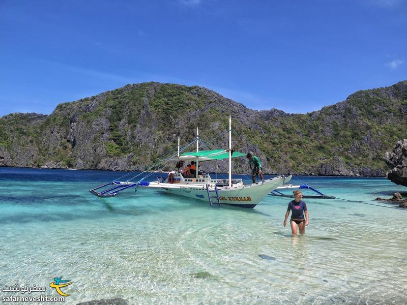 سپس با قایق محلی چوبی کهنه ای که هر لحضه فکر میکردیم داریم غرق می شویم، حدود دو ساعت به سمت مقصدمان یعنی جزیره بکر کالاگواس حرکت کردیم. در طول مسیر به جزایر زیبای مختلفی برخوردیم. بلافاصله بعد از رسیدنمون در آب نیلگون شنا کردیم و بعد یک دل سیر ناهار، غذاهای محلی فیلپینی خوردیم.